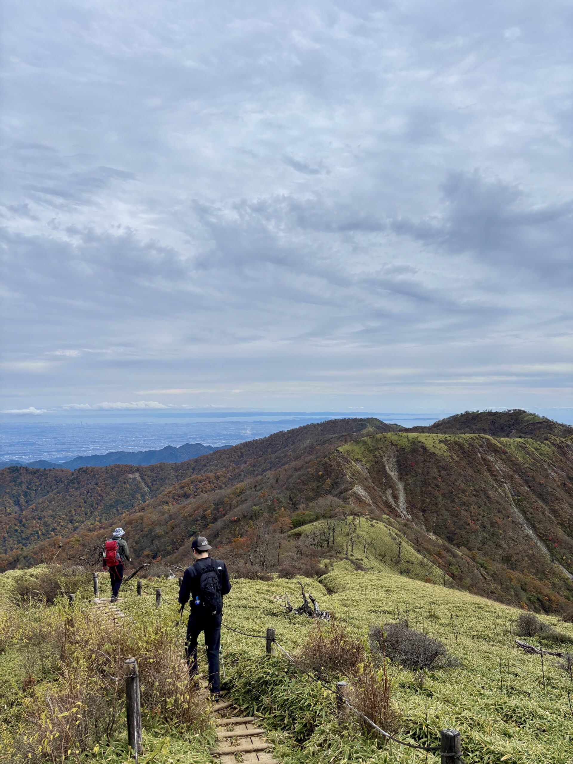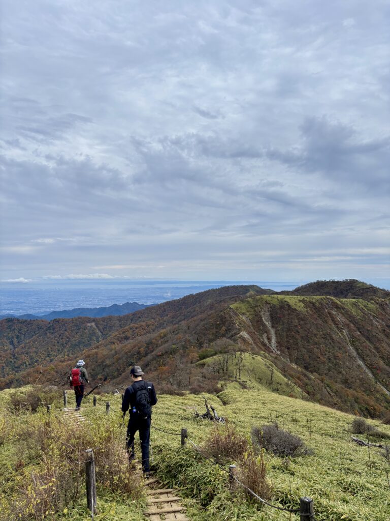 丹沢山から蛭ヶ岳までは今回の目的となる尾根道。とても見晴らしがよく、笹で覆われた尾根を線路のように木道が続いており、素晴らしい眺望。途中何度か急な勾配もあるが、景色がいいので楽しんで歩くことができた。