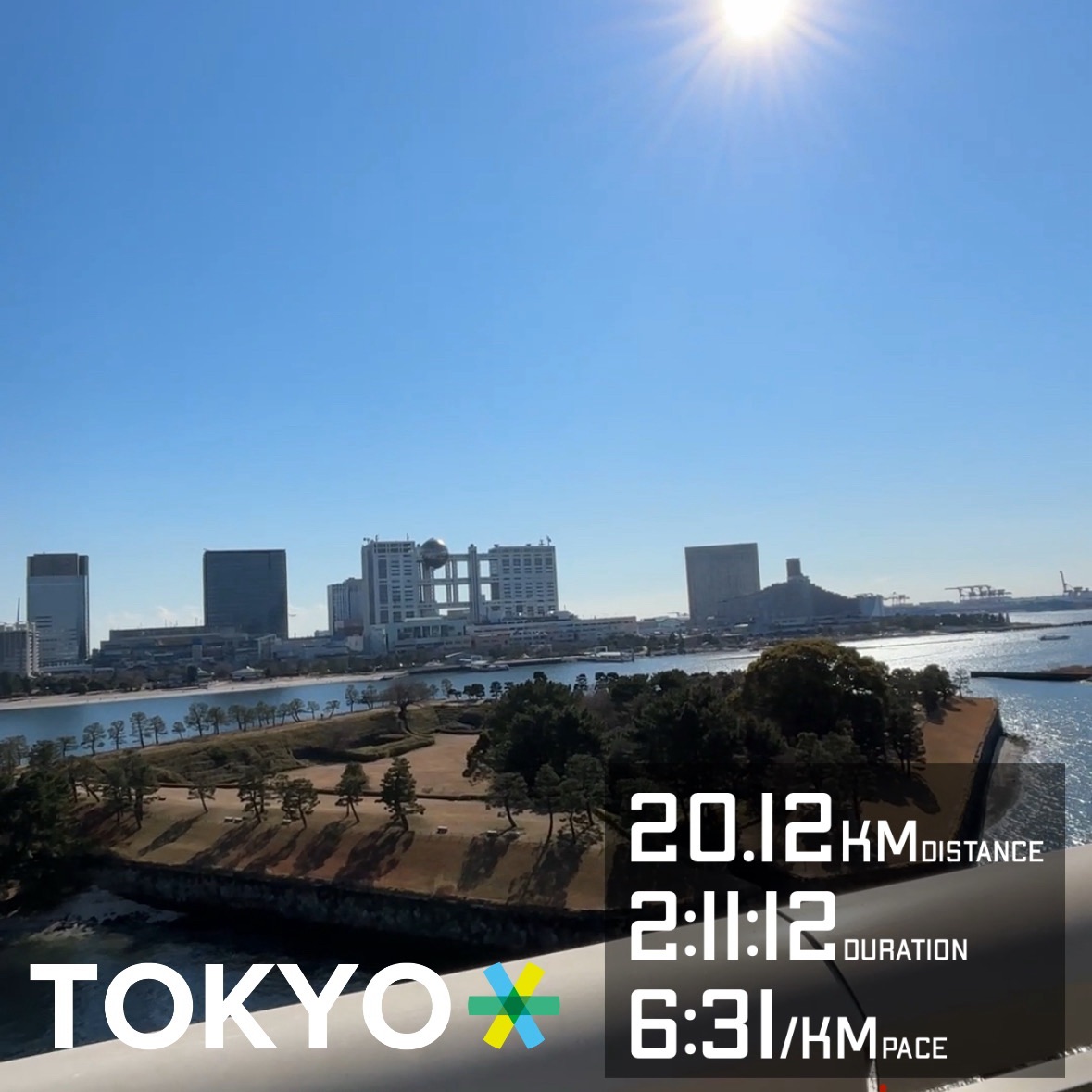 今回のメンバーにはハーフマラソン出場予定の友人がいました。今日の20kmは達成してほしいという思いもありましたが、レインボーブリッジを渡った13㎞あたりでひざの痛みが出て離脱。