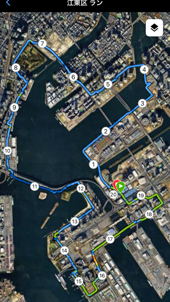 レインボーブリッジを走ってみたい人、東京湾岸で20km走れるコースを探している人には、かなりおすすめできるルートです。