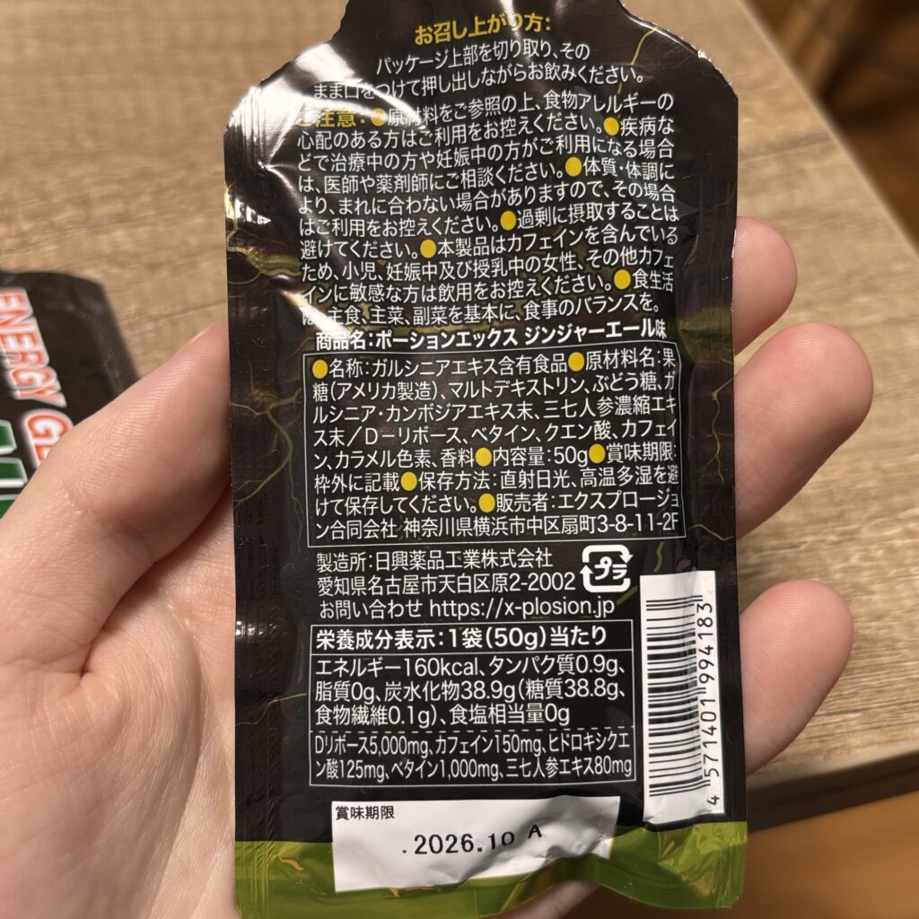 ポーションXは持ち運びやすいパウチタイプのエネルギージェルで、1本あたり約160kcalのエネルギー補給を想定した設計です。フレーバーは複数ありますが、今回選んだのはジンジャーエール味。ジンジャーエール味とエナジードリンク味はD-リボースというATP生産に直結するといわれる成分を5000mg含んでいます。