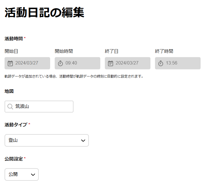 活動終了後、活動日記の「編集する」メニューから「地図」の項目で、筑波山の地図を適用してみた。